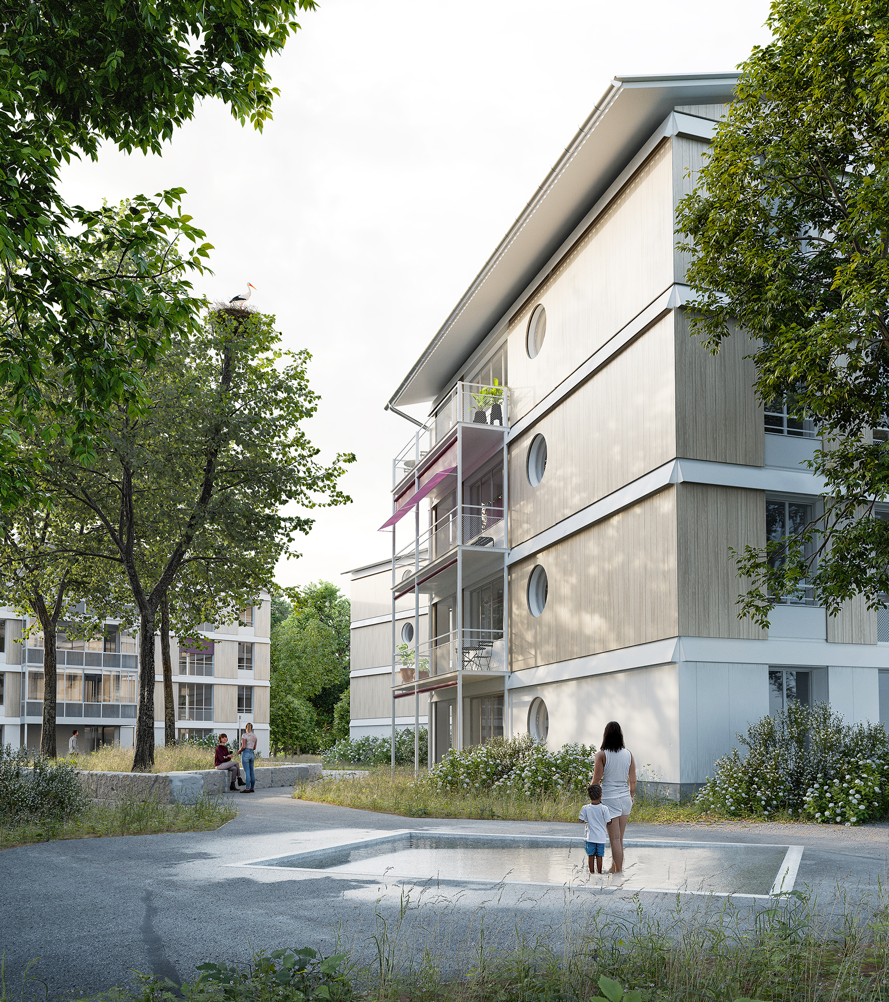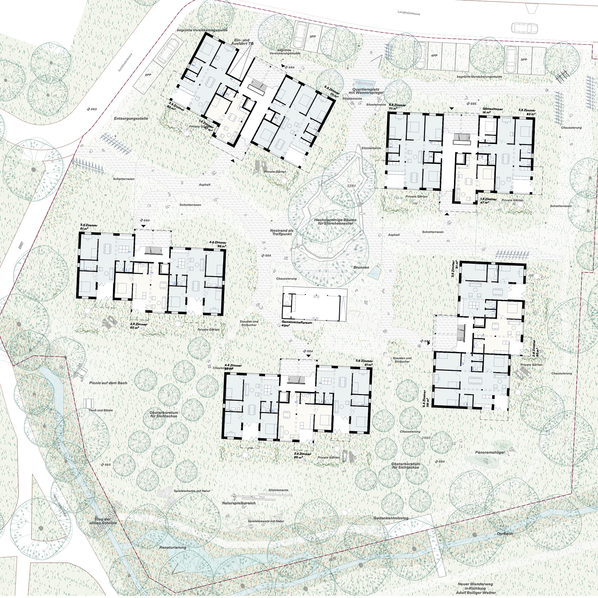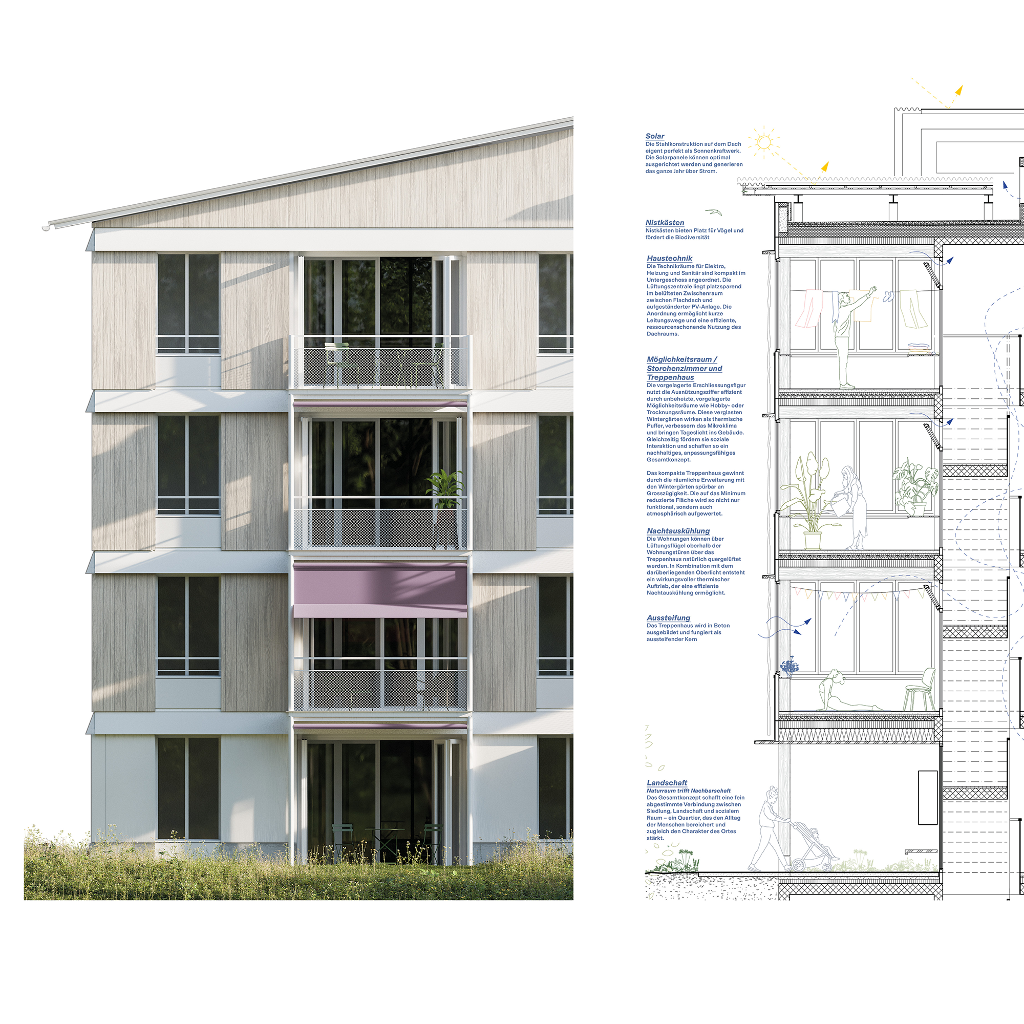 Die neue Siedlung entwickelt die ortstypische Struktur weiter und setzt auf eine starke Verzahnung mit dem baulichen, landschaftlichen und sozialen Kontext. Klare Adressen und fein austarierte Aussenräume schaffen Orientierung und Identifikation. Im Zentrum des Entwurfs steht das Konzept der „Möglichkeitsräume“: unbeheizte, vorgelagerte Wintergärten, die nicht zur Ausnützungsziffer zählen – und dennoch räumlichen, ökologischen und sozialen Mehrwert erzeugen. Sie wirken als thermische Pufferzonen, verbessern das Mikroklima, bringen Tageslicht tief in die Erschliessung und senken die Betriebskosten. Als flexible Räume – von Atelier über Musikzimmer bis Hausaufgabenraum – reagieren sie auf wechselnde Lebensrealitäten. Gleichzeitig entstehen Orte informeller Begegnung, die die Nachbarschaft stärken. Das Konzept versteht Wohnen als dynamischen Prozess: ein robustes System, das neue Wohnqualitäten schafft, Spielräume im Baurecht nutzt und auf zukünftige Entwicklungen reagieren kann. Die Architektur stärkt den gemeinschaftlichen Charakter der Siedlung, ohne die Privatheit zu vernachlässigen. Durch gezielte Blickbezüge entsteht ein ausgewogenes Verhältnis von Rückzug und Teilhabe. So trägt das Projekt zur sozialen Durchmischung und langfristigen Identitätsbildung bei.