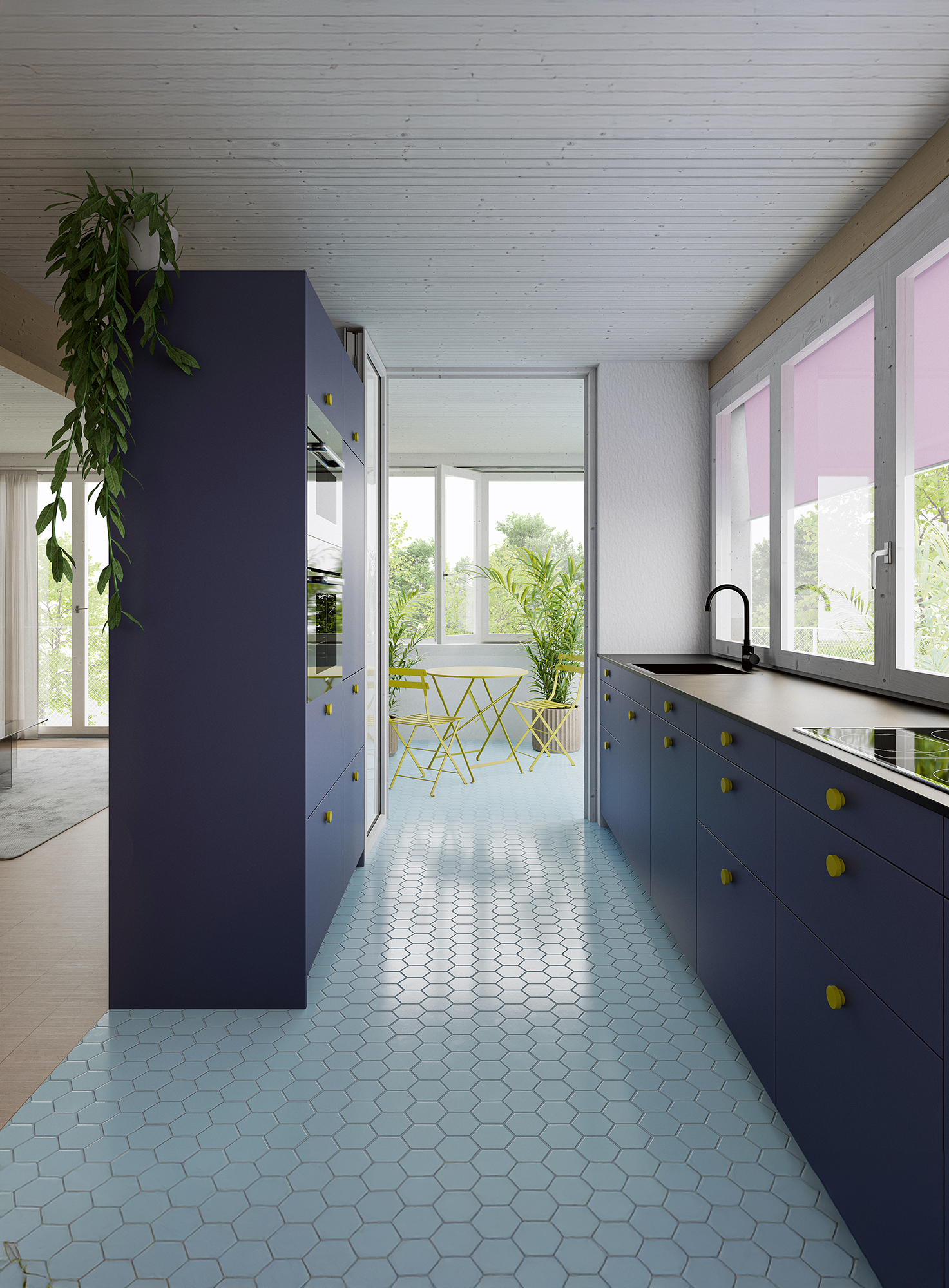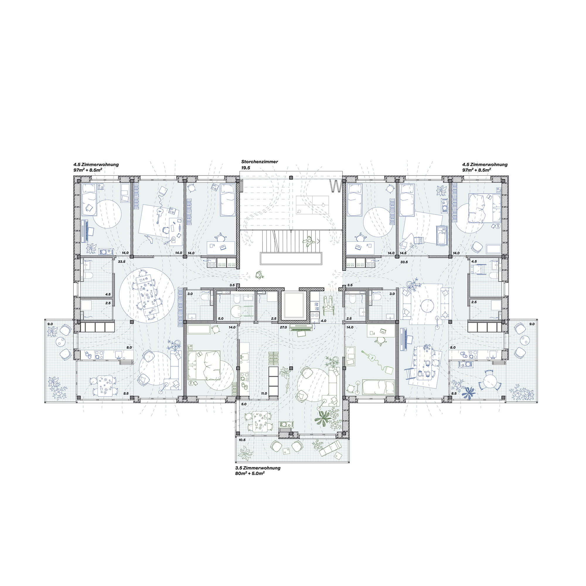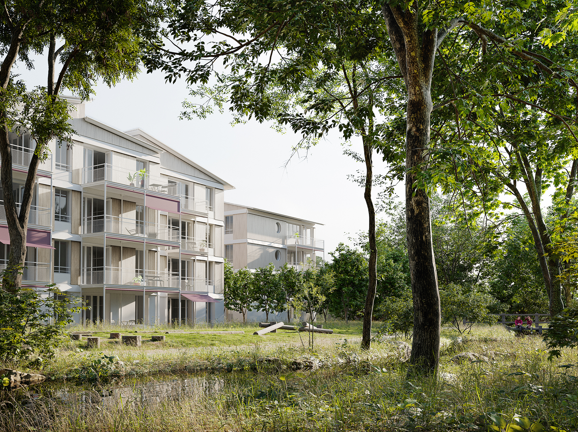 Die neue Siedlung entwickelt die ortstypische Struktur weiter und setzt auf eine starke Verzahnung mit dem baulichen, landschaftlichen und sozialen Kontext. Klare Adressen und fein austarierte Aussenräume schaffen Orientierung und Identifikation. Im Zentrum des Entwurfs steht das Konzept der „Möglichkeitsräume“: unbeheizte, vorgelagerte Wintergärten, die nicht zur Ausnützungsziffer zählen – und dennoch räumlichen, ökologischen und sozialen Mehrwert erzeugen. Sie wirken als thermische Pufferzonen, verbessern das Mikroklima, bringen Tageslicht tief in die Erschliessung und senken die Betriebskosten. Als flexible Räume – von Atelier über Musikzimmer bis Hausaufgabenraum – reagieren sie auf wechselnde Lebensrealitäten. Gleichzeitig entstehen Orte informeller Begegnung, die die Nachbarschaft stärken. Das Konzept versteht Wohnen als dynamischen Prozess: ein robustes System, das neue Wohnqualitäten schafft, Spielräume im Baurecht nutzt und auf zukünftige Entwicklungen reagieren kann. Die Architektur stärkt den gemeinschaftlichen Charakter der Siedlung, ohne die Privatheit zu vernachlässigen. Durch gezielte Blickbezüge entsteht ein ausgewogenes Verhältnis von Rückzug und Teilhabe. So trägt das Projekt zur sozialen Durchmischung und langfristigen Identitätsbildung bei.